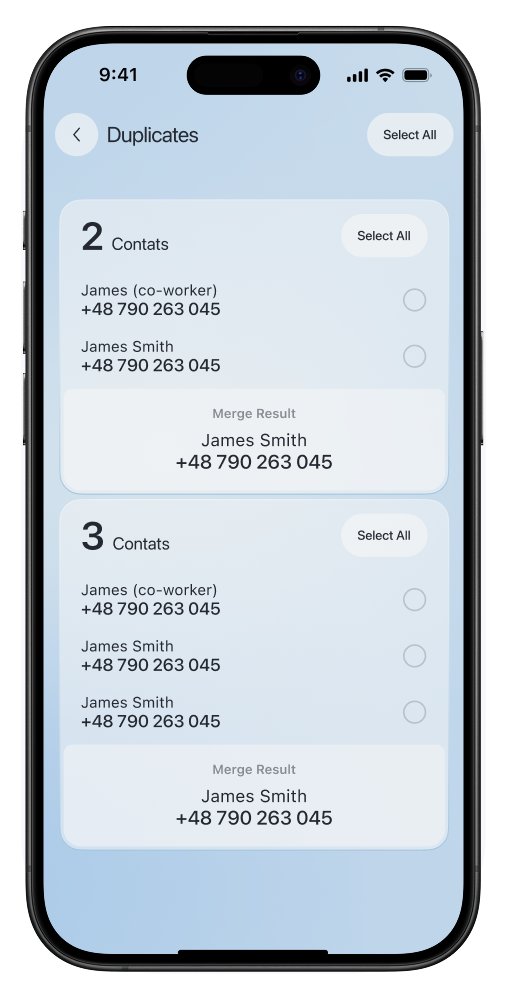 Keep your contact list organized by merging entries with the same name or number.